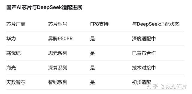 目前国产AI芯片如华为昇腾、寒武纪、海光等都已宣布支持FP8算法。特别是华为昇腾950PR预计将支持FP8和FP4格式,算力达到1PFLOPS(FP8)/2PFLOPS(FP4)。