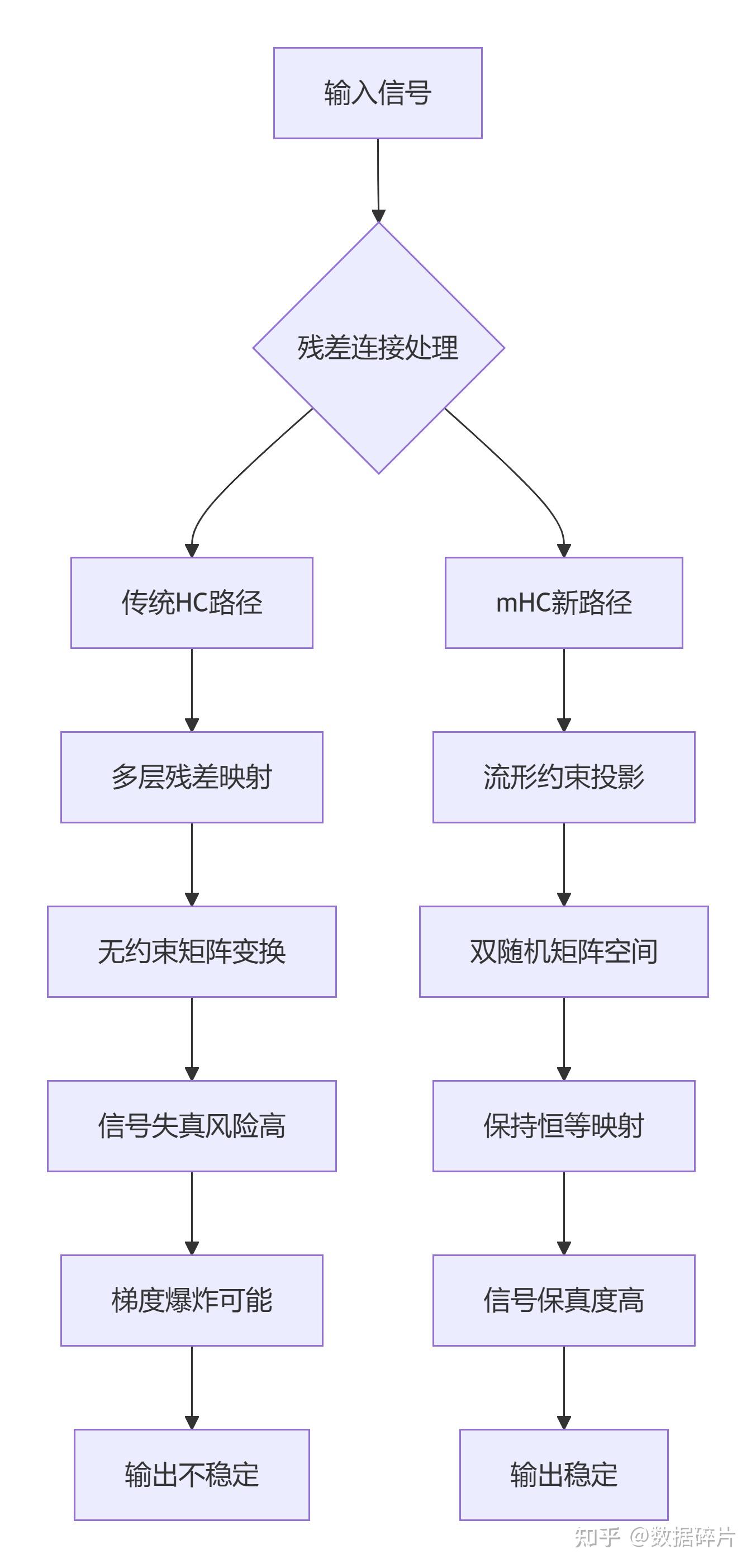 mHC方案通过将HC中的残差映射矩阵投影到双随机矩阵构成的“流形空间”,在保留拓扑表达力的同时,恢复原始残差连接的恒等映射性质。这一创新相当于为神经网络的“学习过程”划定了一个安全的操场,既允许自由探索,又确保不会失控“跑飞”。