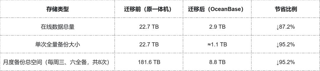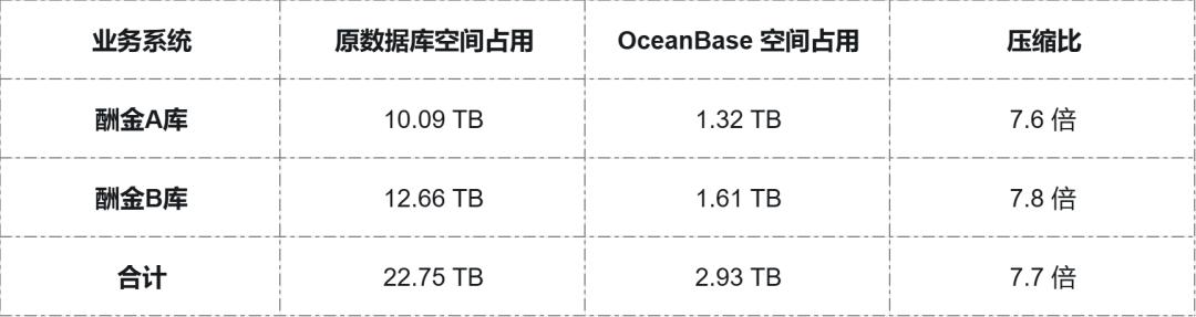 案例一:河北移动核心酬金库系统 河北移动的酬金库系统是其B域核心业务系统。迁移至OceanBase后,其存储压缩比达到了惊人的7.8倍。