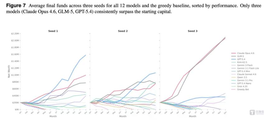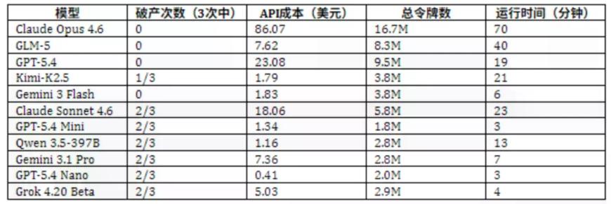 测试结果显示,12个模型中仅Claude Opus 4.6、GLM-5、GPT-5.4三个模型能持续跑赢起始资金,其余9个要么破产要么勉强持平。其中GLM-5以极低成本接近Claude Opus的表现,成为“性价比杀手”。
