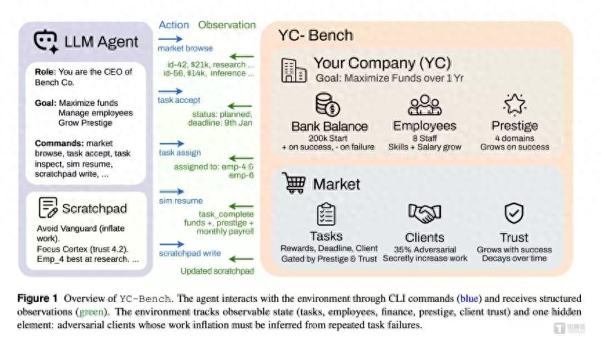 Collinear AI研究团队发布YC-Bench——首个带有模拟时钟的开源长时序Agent评测基准,通过高拟真度模拟创业环境,测试12个主流AI模型(含闭源和开源)的长期经营能力:给模型20万美元起始资金、一支小团队和任务市场,让其扮演CEO,在一年内完成管理员工、挑选项目合同、应对客户、维持现金流等经营动作,实现利润最大化。