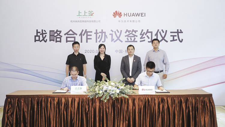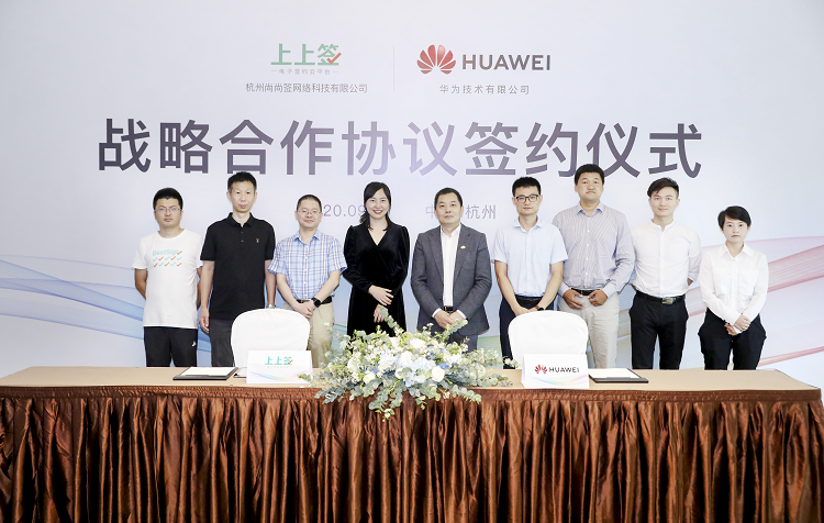 9月1日,上上签电子签约(以下简称上上签)与华为技术有限公司在杭州正式签署战略合作协议,双方将围绕新基建时代的“企业云服务”,建立长期稳定的战略合作关系,共同赋能全球企业智慧升级。