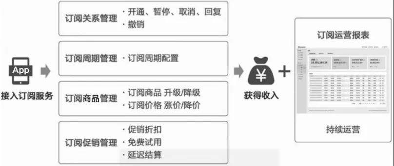 ▲图2-7 全球主流支付方式 2)IAP提供多种支付配套能力(见图2-8),包括商品管理、订单管理和订阅管理。商品管理支持超过62种语言、195个商品价格档位,支持170多个国家的本地货币自动定价,可根据国家或区域来调整定价策略。 订单管理提供了丰富的订单管理开放接口,能够记录完整的订单信息,主动查询异常订单并及时补发,实现“零掉单”。订阅服务提供多样化的订阅策略,包括促销折扣、免费试用和延迟结算,支持订阅周期可配置。