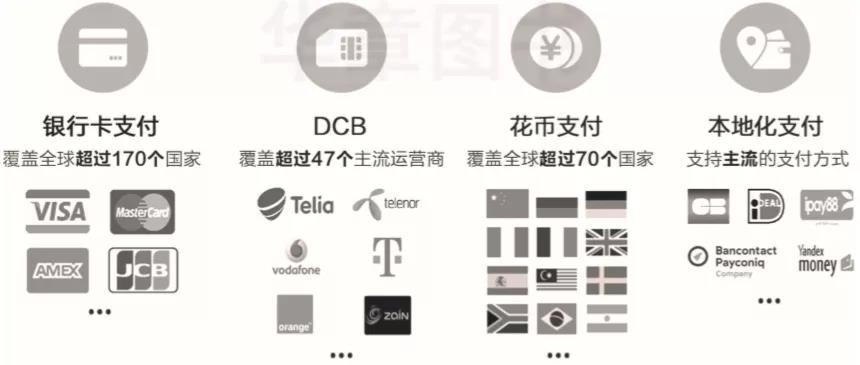 03 盈利:利用多渠道实现开发者变现 开发者开发一款App所追求的商业目标是盈利,通常需要通过广告或付费模式进行变现。在付费模式下,App需要提供购买支付能力,对接支付系统。 而实际情况下,开发者面临很多支付通道选择,包括支付宝、微信、银联和运营商支付等。与多个支付系统实现对接,存在开发成本高、对接联调的时间周期很长的问题。华为支付可以帮你简化这些工作。 1)华为IAP(In App Purchase)覆盖全球主流支付方式,聚合多条支付通道,提供全球化的支付服务。主要支付方式包括银行卡支付、DCB(Direct Carrier Billing)、花币支付和第三方支付(见图2-7)。 其中,银行卡支付覆盖170多个国家,DCB支付覆盖超过47家运营商,花币支付覆盖全球70多个国家,第三方支付支持微信、支付宝、Sofort和iDeal等支付方式。